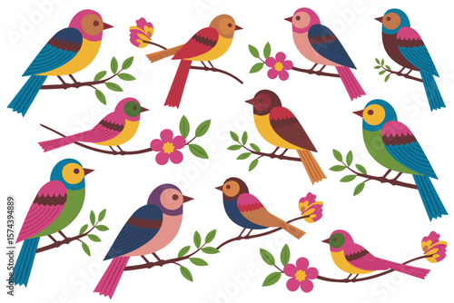 Fototapeta premium Charming Illustration Colorful Birds Perched on Branches Amidst Flowers, Ideal for Spring and Nature Themes