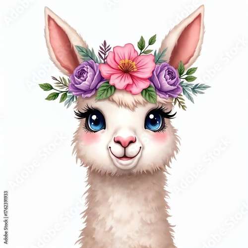 Naklejka premium Charming illustration of a llama adorned with floral wreath. Cartoon alpaca has big blue eyes and gentle smile. Lovely animal portrait on a white background suitable for various design projects.