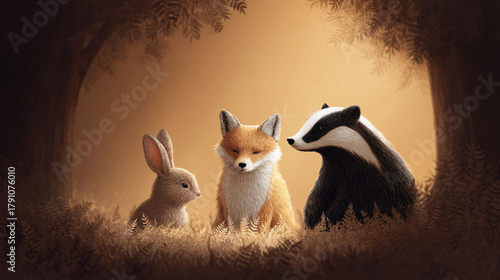 Obraz premium Charming illustration of a rabbit, fox, and badger in a serene woodland setting. Evokes friendship, harmony, and nature. Ideal for childrens books, and warm, inviting designs.
