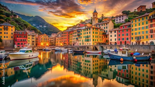 © Arnada, Obraz premium Charming Italian Coastal Village: Picturesque Camogli Harbor at Sunset