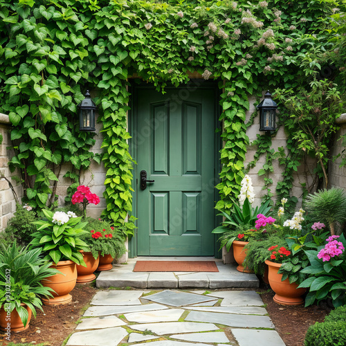 Fototapeta premium Charming Ivy-Covered Entrance with Green Door and Potted Plants
