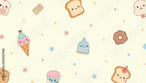 Fototapeta premium Charming kawaii food characters including toast ice cream cone cupcake and donut scattered on a pastel background