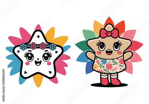 © Laila, Obraz premium Charming Kawaii Star Set: Smiling Stars, Flowers More
