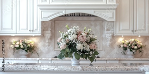 Fototapeta premium Charming kitchen interior featuring white cabinetry and floral arrangements with ample space for text or promotional content