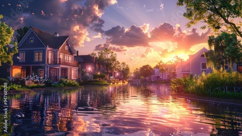 Obraz premium Charming Lakeside Homes at Sunset