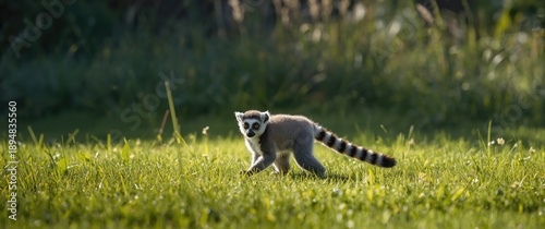Fototapeta premium Charming lemur with raised tail walking across the lawn