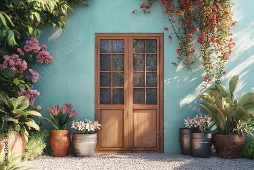 © MrHamster, Naklejka premium Charming, light-filled exterior entrance with lush greenery.