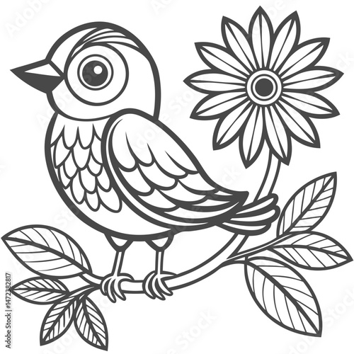 © Tahmina, Fototapeta premium Charming Little Bird Perched on a Branch with a Blooming Flower Black and White Coloring Page Illustration