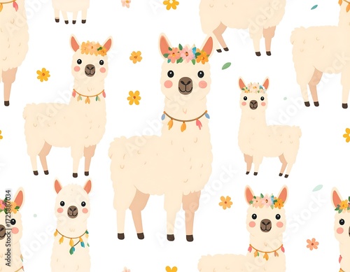 © Yangay, Obraz premium Charming Llama Pattern with Flower Crowns
