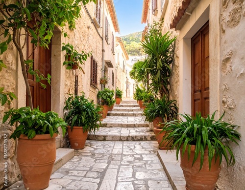 © RonKris, Fototapeta premium Charming Mediterranean Alley with Stone Steps and Terracotta Potted Plants