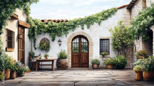Obraz premium Charming Mediterranean Courtyard with Lush Greenery and Rustic Design...