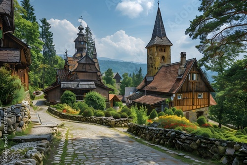 © Valentin, Fototapeta premium Charming Mountain Village with Historic Architecture and Lush Greenery