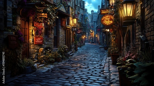 © Arif, Fototapeta premium Charming Narrow Nighttime Alley with Rustic Lanterns and Cobblestone Path
