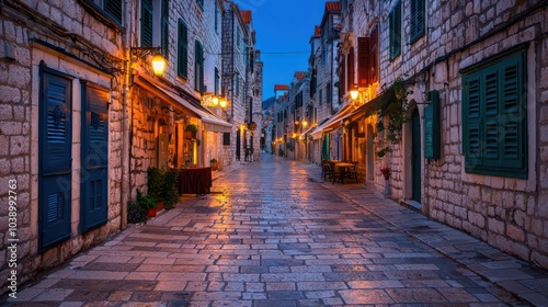 Fototapeta premium Charming narrow street with stone buildings illuminated at dusk, inviting...