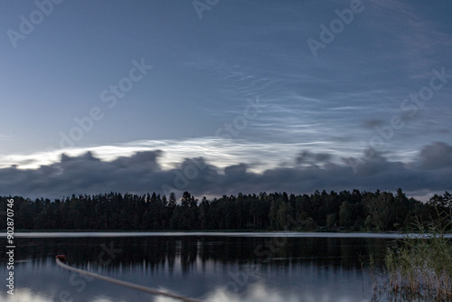 Fototapeta premium charming night landscape with silver clouds, silver clouds over the lake, dark forest silhouette in the background, mesospheric clouds