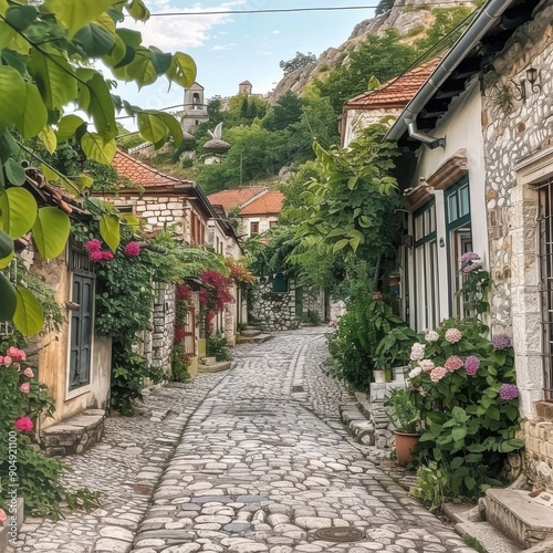 © Castle, Fototapeta premium Charming old village with cobblestone streets and quaint houses calm background