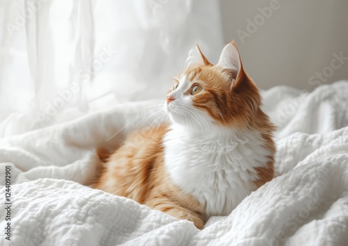 © ANUAR, Naklejka premium Charming Orange Cat Relaxing on Soft White Bedding with Dreamy Expression in Sunlit Room
