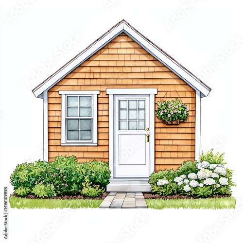 Fototapeta premium Charming Orange House with White Trim and Flower Pots Surrounded by Lush...
