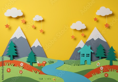 © Creative Design, Fototapeta premium Charming papercraft landscape with house mountains and river