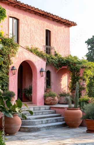 Fototapeta premium Charming Pink Stucco Villa with Lush Green Garden