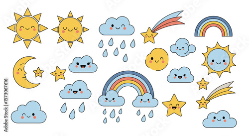 © Sarah, Fototapeta premium Charming pixel art weather icons featuring smiling suns clouds rainbows stars and shooting stars for creative projects