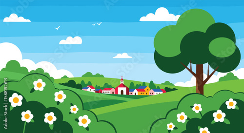 © Shoubj, Fototapeta premium Charming Pixelated Countryside Village Scene with Rolling Hills and Blossoming Flowers Under a Bright Blue Sky