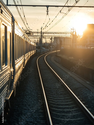© Generative AI, Obraz premium Charming Railway Track Curving Towards a Vibrant Sunset in a Serene Environment : Generative AI