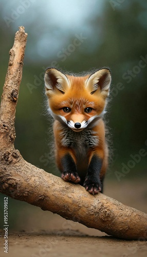 Fototapeta premium Charming Red Fox Cub Playfully Climbing a Branch in a Lush Green Forest...