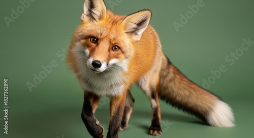 Fototapeta premium Charming Red Fox Walking on a Green Background in Bright Light