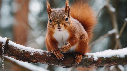 Fototapeta premium Charming red squirrel perched on a branch, showcasing its beauty in a serene winter landscape