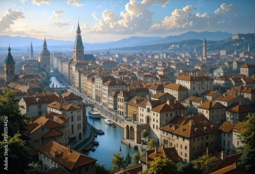 Naklejka premium Charming riverside town with stunning architecture under a serene sky at dusk
