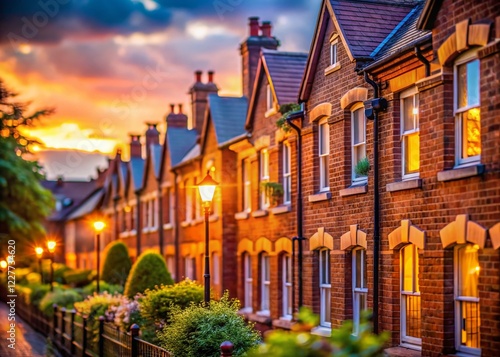 © Four888, Fototapeta premium Charming Row of Red Brick Terraced Houses with Bokeh Background - UK Architecture Stock Photo