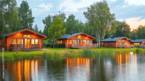 Obraz premium Charming Rustic Cabins by Lakes at Twilight