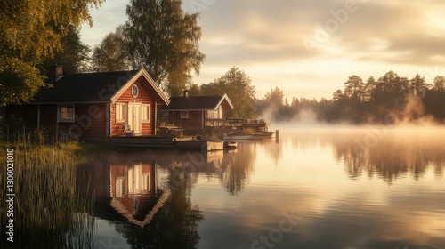 Fototapeta premium Charming Rustic Cabins by the Lake at Sunrise