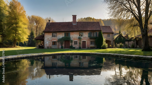 © Artzio, Obraz premium Charming rustic house by reflective pond