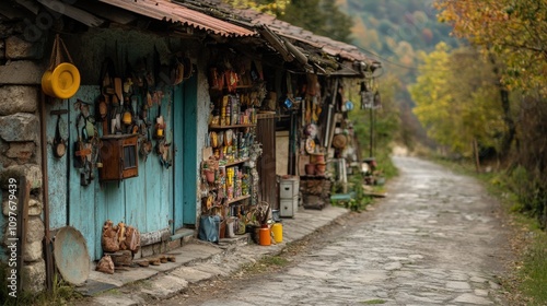 Obraz premium Charming Rustic Shop on a Serene Country Road Surrounded by Lush Nature and...