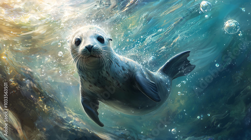 Fototapeta premium Charming seal swims gracefully beneath the waves captivating oceanic beauty...