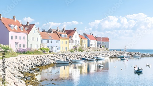 Naklejka premium Charming seaside town with pastel houses, ocean waves hitting rocky shores,...