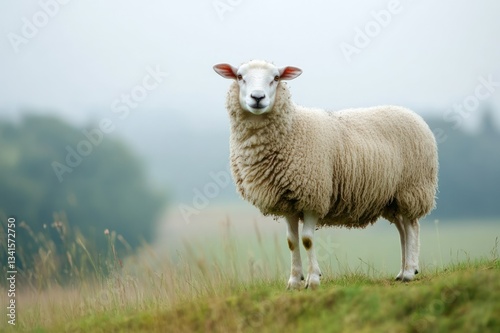 © Nico, Obraz premium Charming Sheep Standing Gracefully in Lush Green Field on a Misty Day