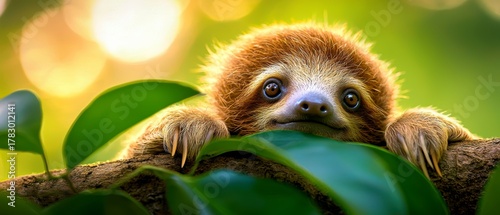 Naklejka premium Charming Sloth Encounter in Lush Rainforest Wildlife Photography Natural...