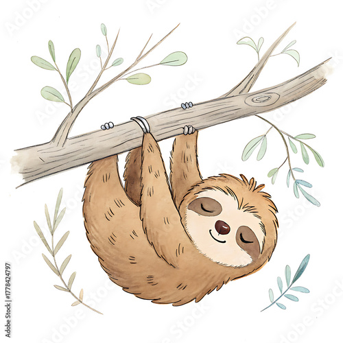 Obraz premium Charming Sloth Hanging from Tree Branch, Cute Animal Illustration, Peaceful...