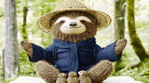 Fototapeta premium Charming Sloth in a Blue Jacket and Straw Hat Meditating Peacefully in a Lush Green Forest