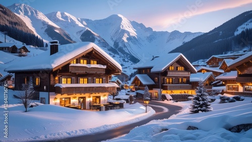 © RaksaLinggo, Fototapeta premium Charming snow covered village nestled in a mountainous winter landscape