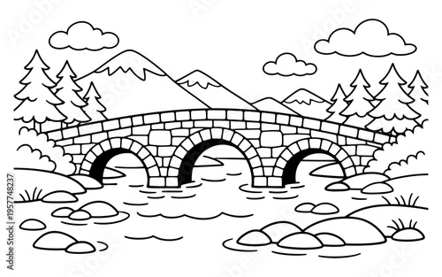© 123levit, Obraz premium Charming stone arch bridge crosses a flowing river amidst scenic mountains and pine trees