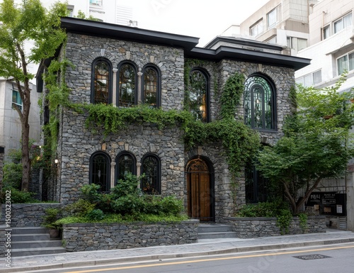 © Suryadil, Fototapeta premium Charming Stone Building with Lush Greenery in Seoul, South Korea