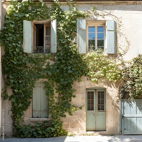 © Alona, Fototapeta premium Charming stone house enveloped by lush green vines in a quaint village basking in the warm afternoon sun