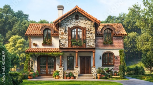 © azi, Fototapeta premium Charming stone house with terracotta roof, surrounded by lush greenery.