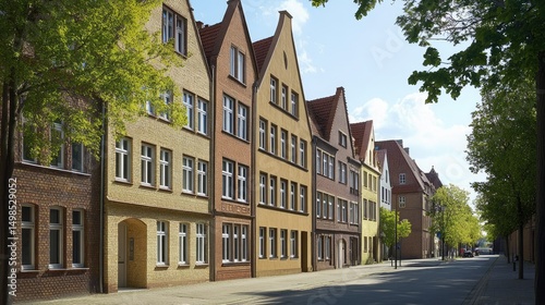 © Magnetix Art, Fototapeta premium Charming Street in German Town, Historic Architecture, Gable Roofs, and Lush Greenery.