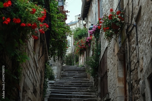 © Yurii Semonov, Naklejka premium Charming street in Montmartre with old stone buildings and hanging flowers