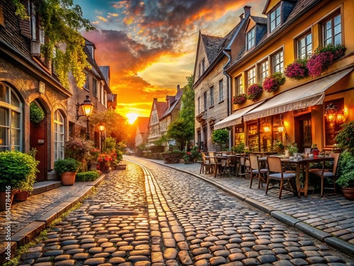 © Arnada, Fototapeta premium Charming Sunset on Cobblestone Street with Historic Houses - Tranquil and Nostalgic Food Photography